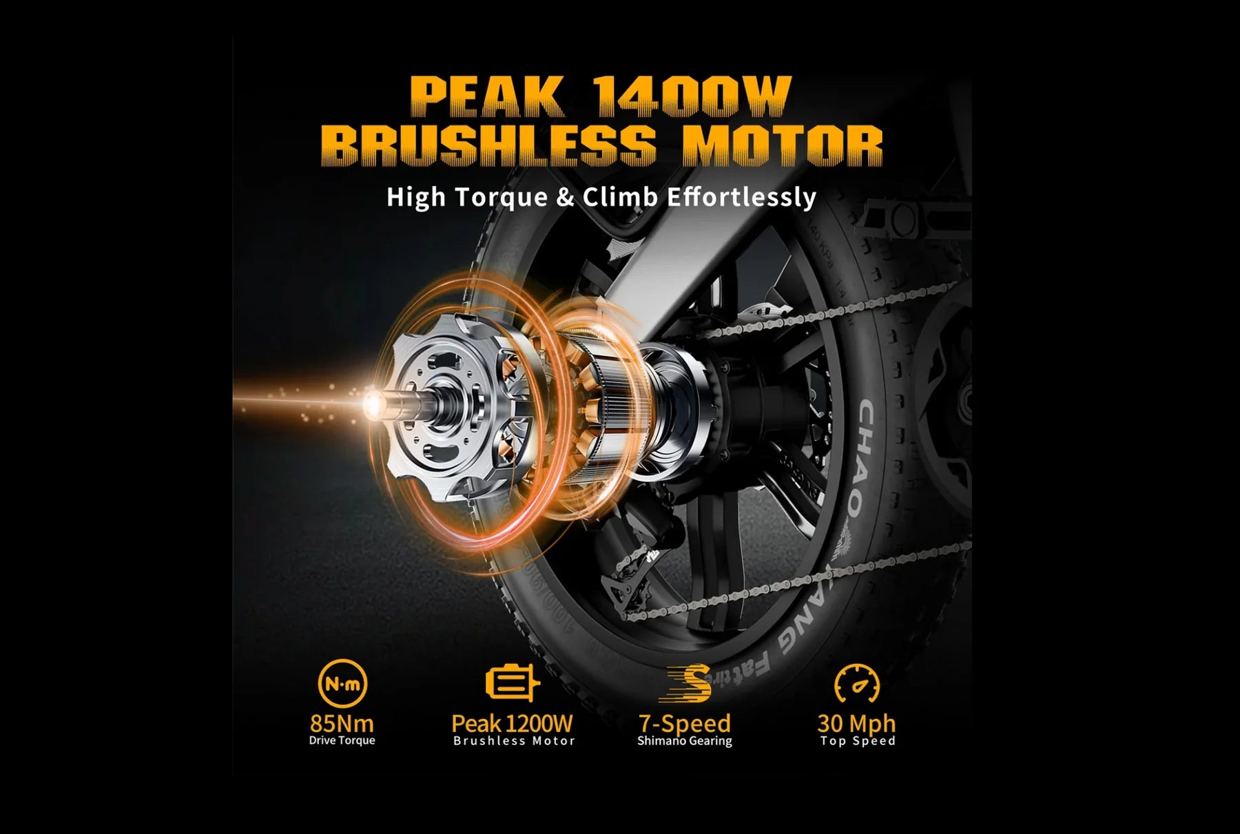 Motor: 1400W (peak), 750W (sustained), 48V BAFANG Brushless Rear Hub Motor with 85Nm