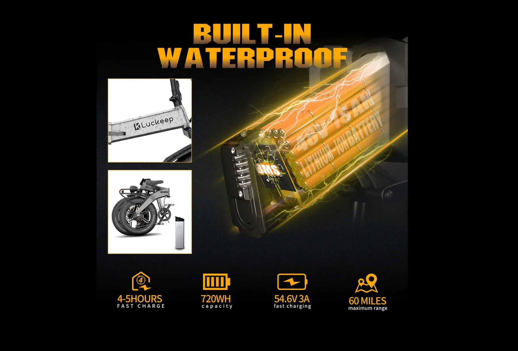 The X1 ebike features a Safety Certified Battery (UL2849 Standard) with a capacity of 720Wh. It only takes 4 hours to fully charge the battery
